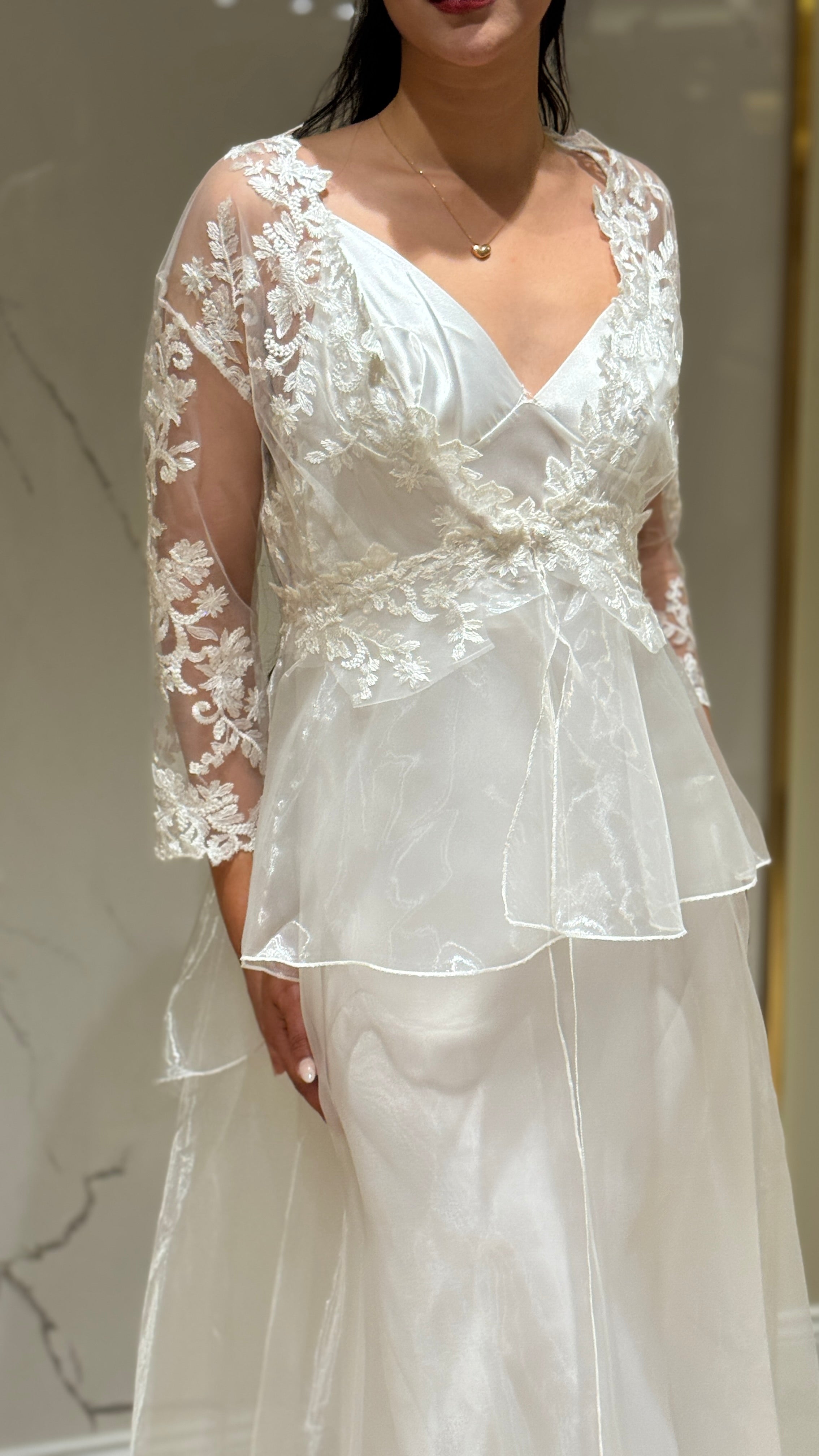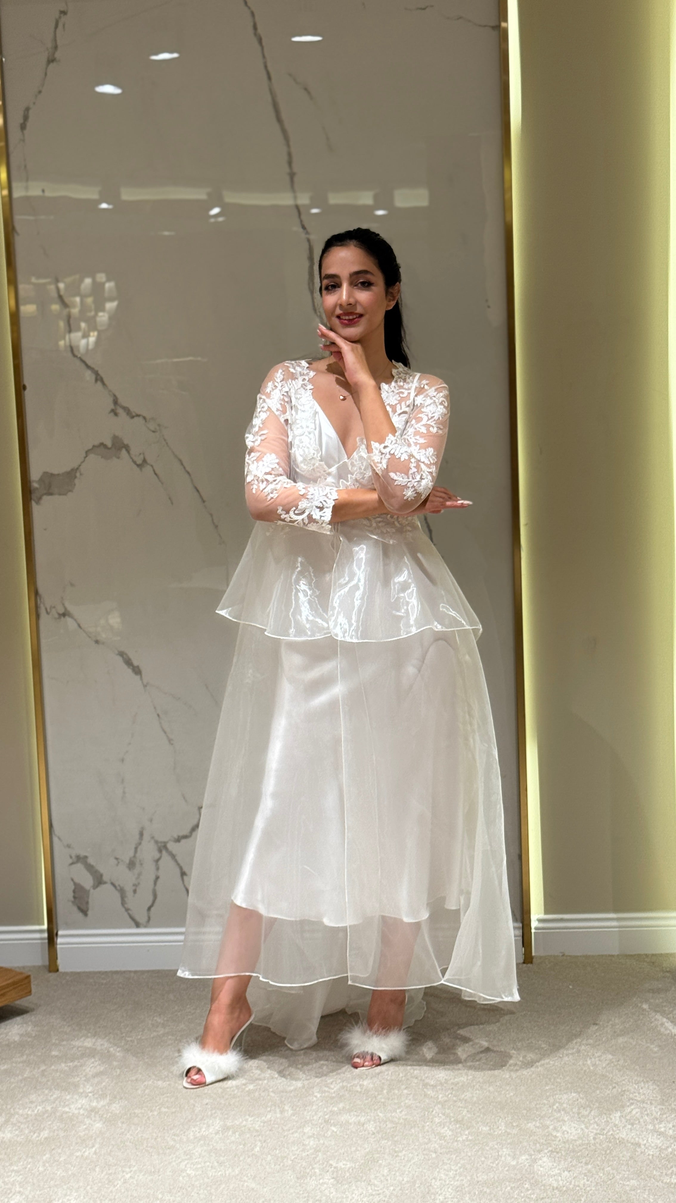 Ürün Özellikleri: V yaka kesimi ve işlemeli dantel kollar, romantik bir hava katarken şık görünmenizi sağlıyor. Belden büzgülü kesimi vücuda zarif bir uyum sağlıyor. Çift katlı tül etek yapısı hem hafif hem de zarif bir siluet oluşturuyor.